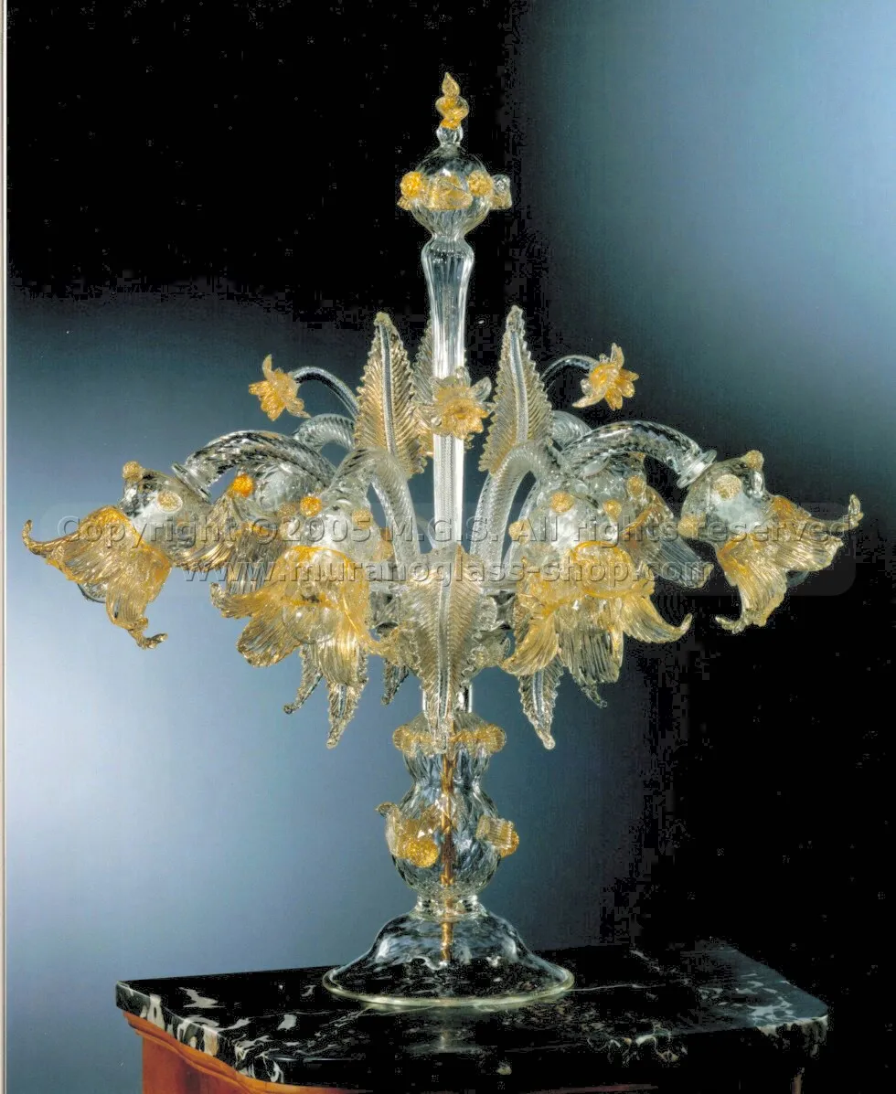 Candelabro da tavolo (Flambò) in cristallo baloton con decoro oro a sei luci.