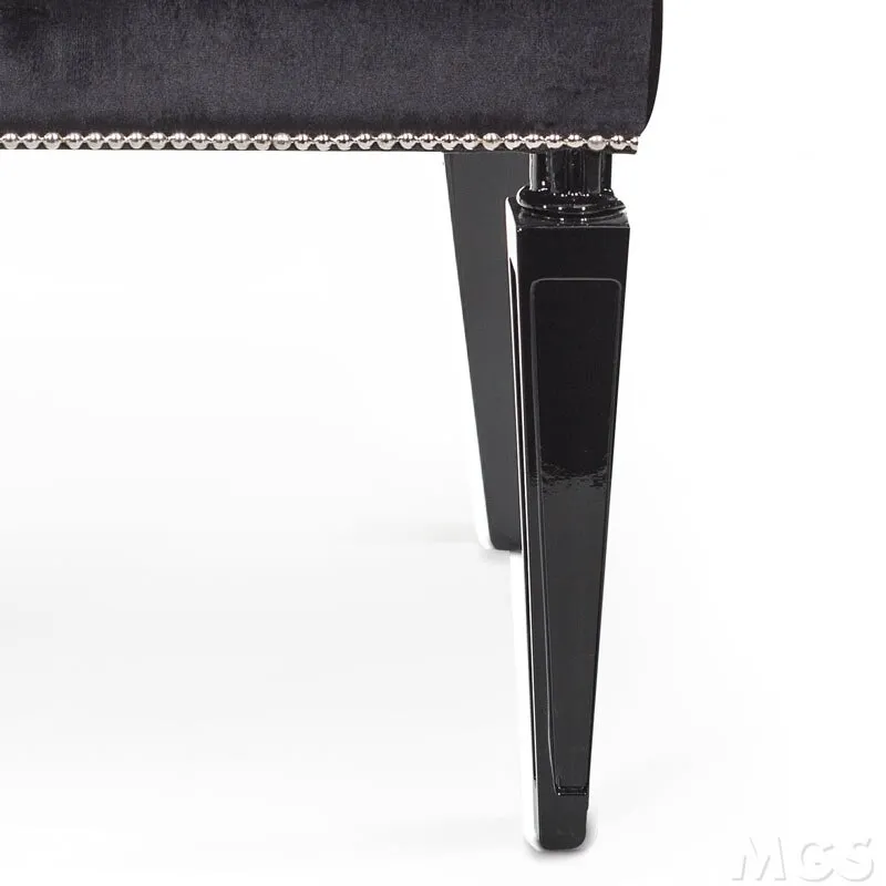 MATERIALI Struttura in legno con gambe laccate nero lucido. Imbottito e rivestito in velluto nero. Decorato con Cammeo rettangolare in vetro cristallo colato fissato con sfere in ottone cromato lucido.