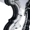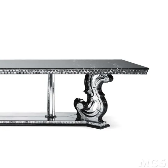 Importante tavolo in specchio anticato, inciso in stile Déco con inserti in vetro molato e legno finito laccato nero lucido. Top in marmo nero Marquina.