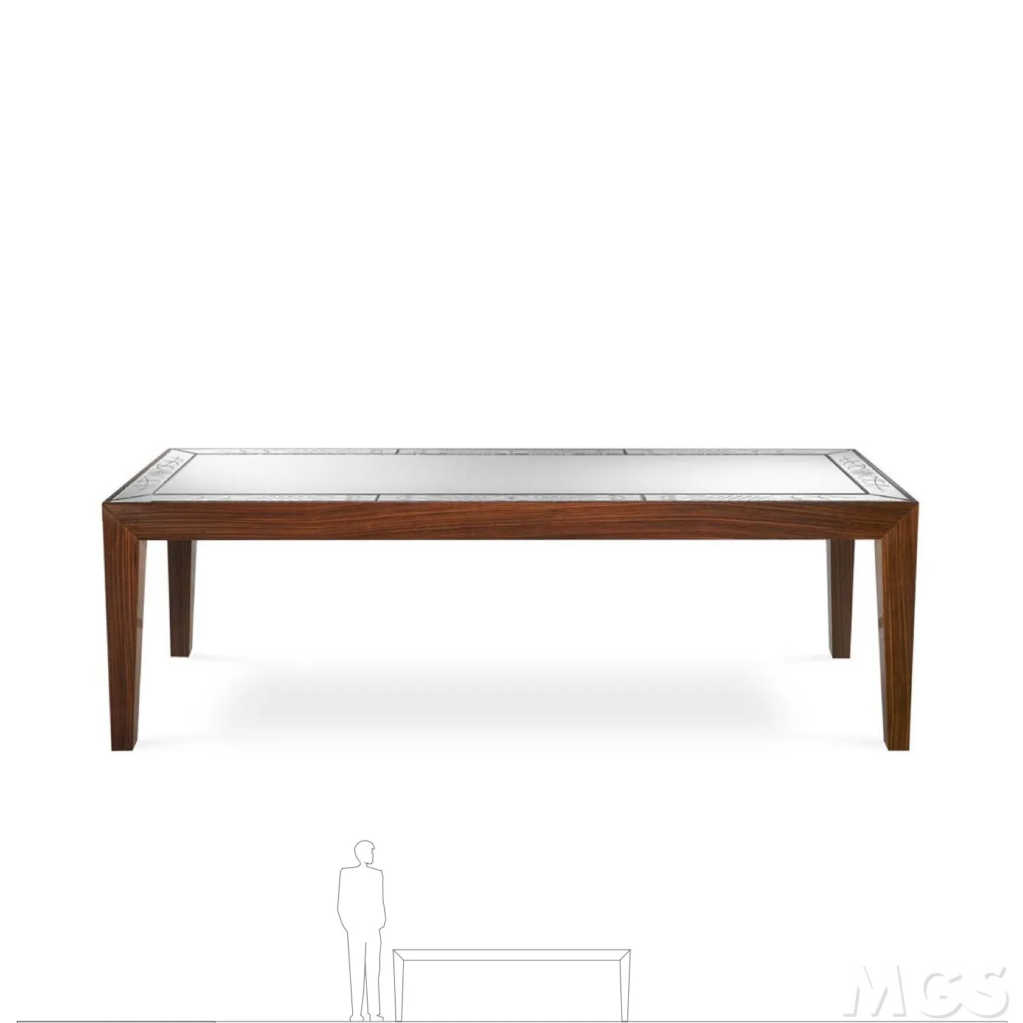 Tavolo in legno di palissandro laccato lucido con top in specchio extra chiaro inciso stile Déco. Design Leo De Carlo.
